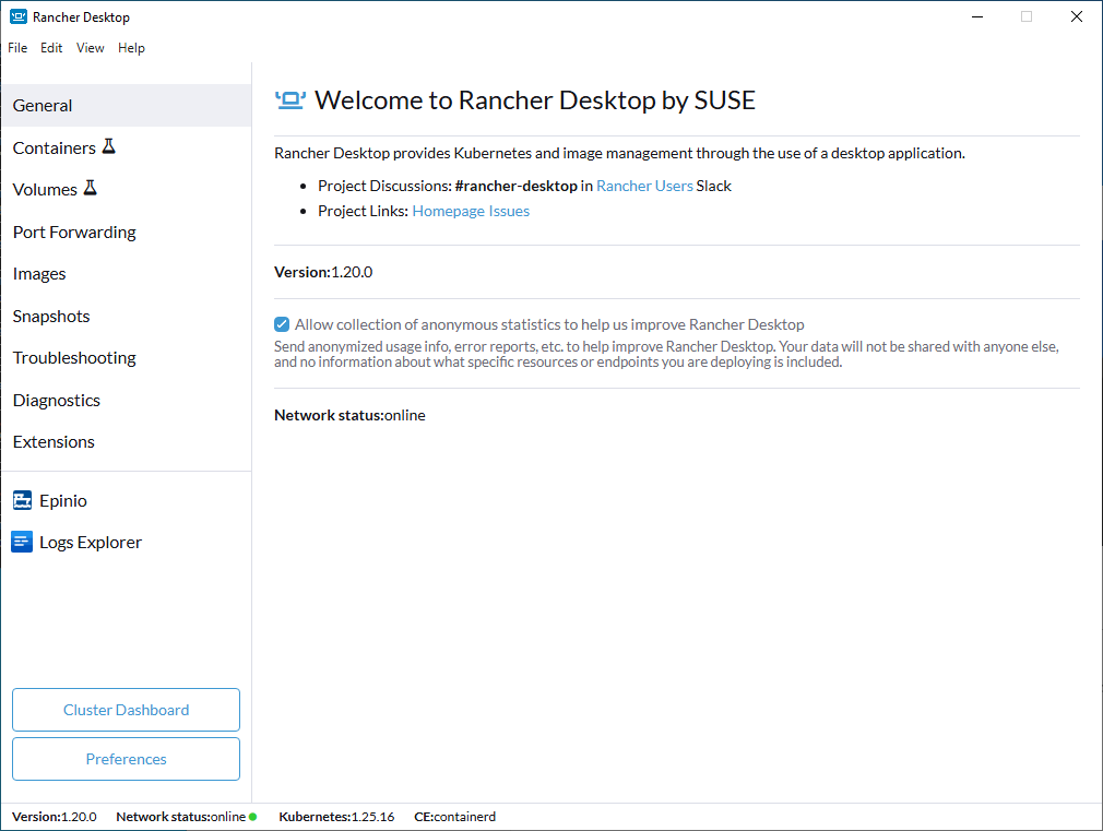 The General tab provides information on communication channels where users can connect with the Rancher Desktop team and community to ask questions, report bugs, or discuss Rancher Desktop in general.