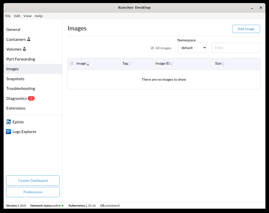 The Images tab allows you to manage local container images via the application Graphical User Interface. Depending on the container engine selected, the options include: