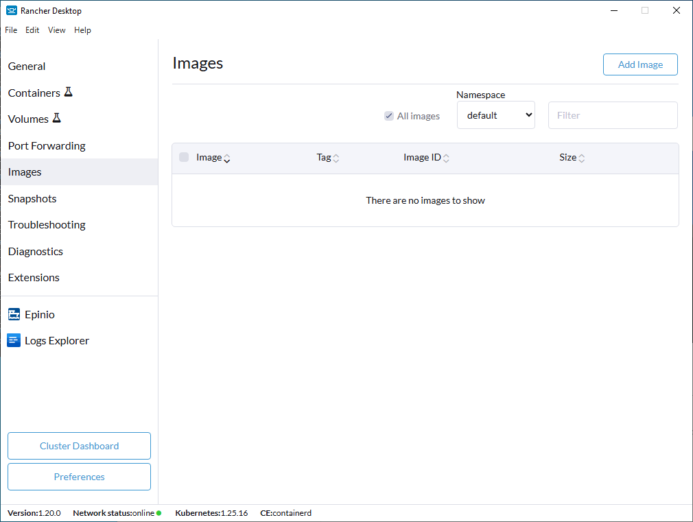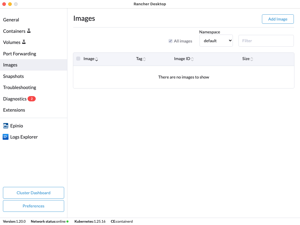 • All Images: This option is only available using the container engine containerd (nerdctl) and k8s.io namespace. This checkbox can be marked to list all images including default application images in the Rancher resource group.