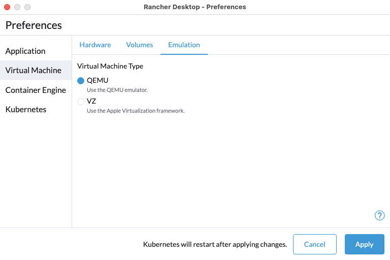 The VZ option is enabled by default and uses the native macOS Virtualization.Framework for running a guest machine. You can switch the virtual machine type after the first run.