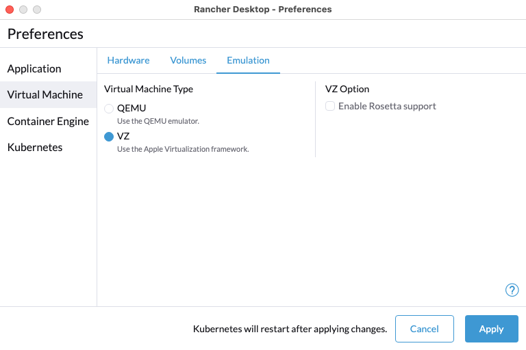 The suboption VZ option can also be enabled if using VZ as your virtual machine type. The suboption enables Rosetta support and allows users to run applications that contain x86_64 instructions on Apple hardware.