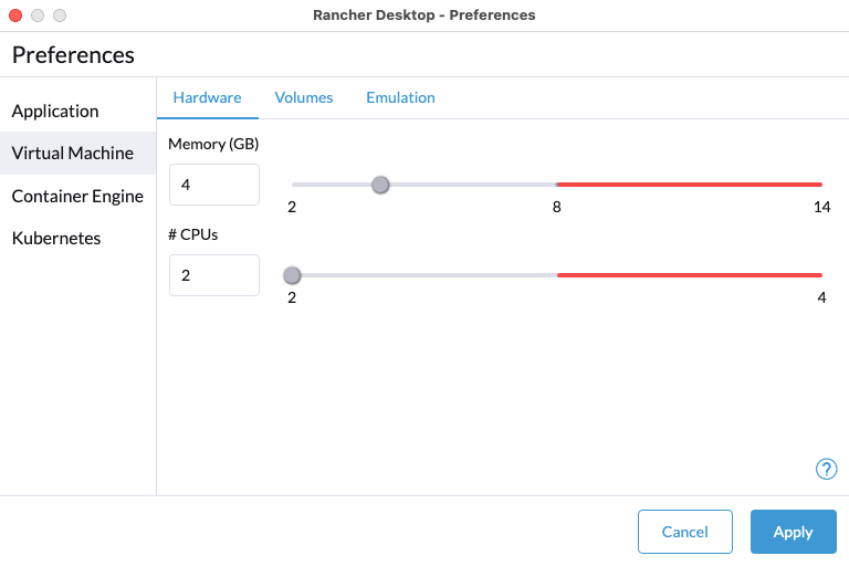 The amount of memory to allocate to Rancher Desktop. The selectable range is based on your system. The red area within the range indicates an allocation that may affect system services.