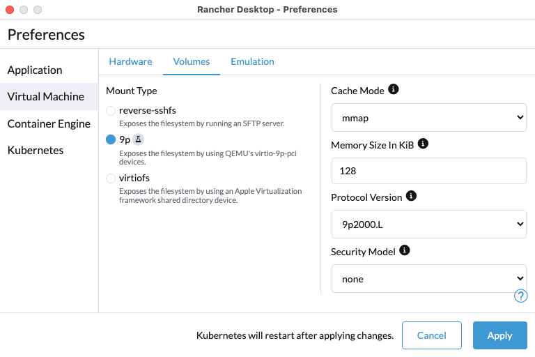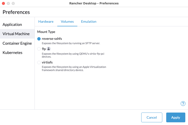 Users can enable the virtiofs mount type from the Volumes tab. This is implemented using the Apple Virtualization.Framework shared directory device.