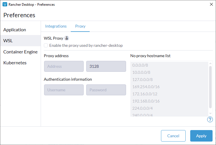 Rancher Desktop now allows local, corporate, or VPN proxy server support for Windows users. The implementation can be enabled or disabled through the Proxy tab to capture network traffic and forward it to an http proxy. Once all information has been input, click the Apply button to have changes immediately take effect.