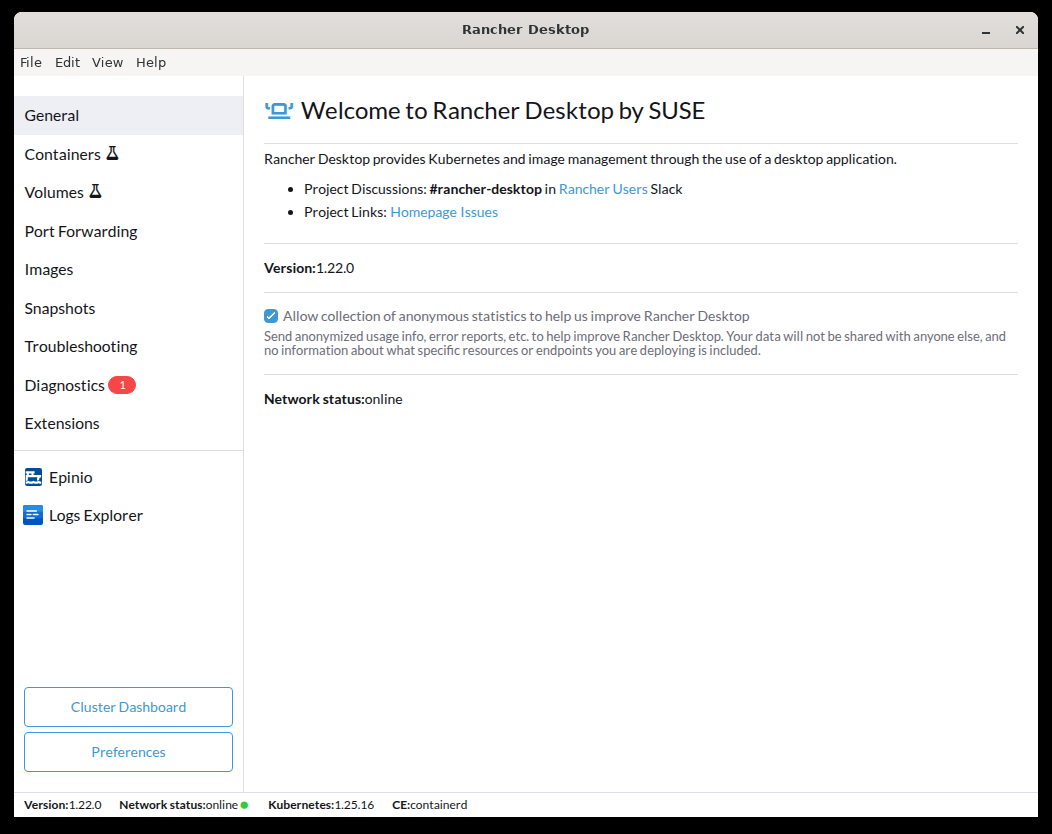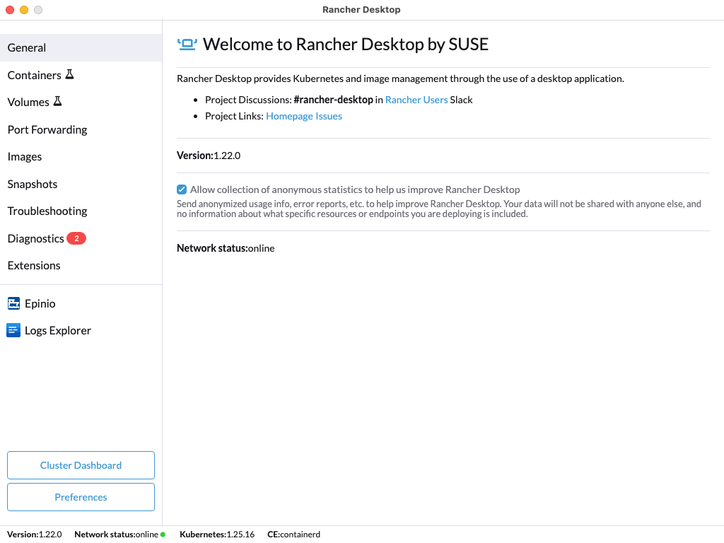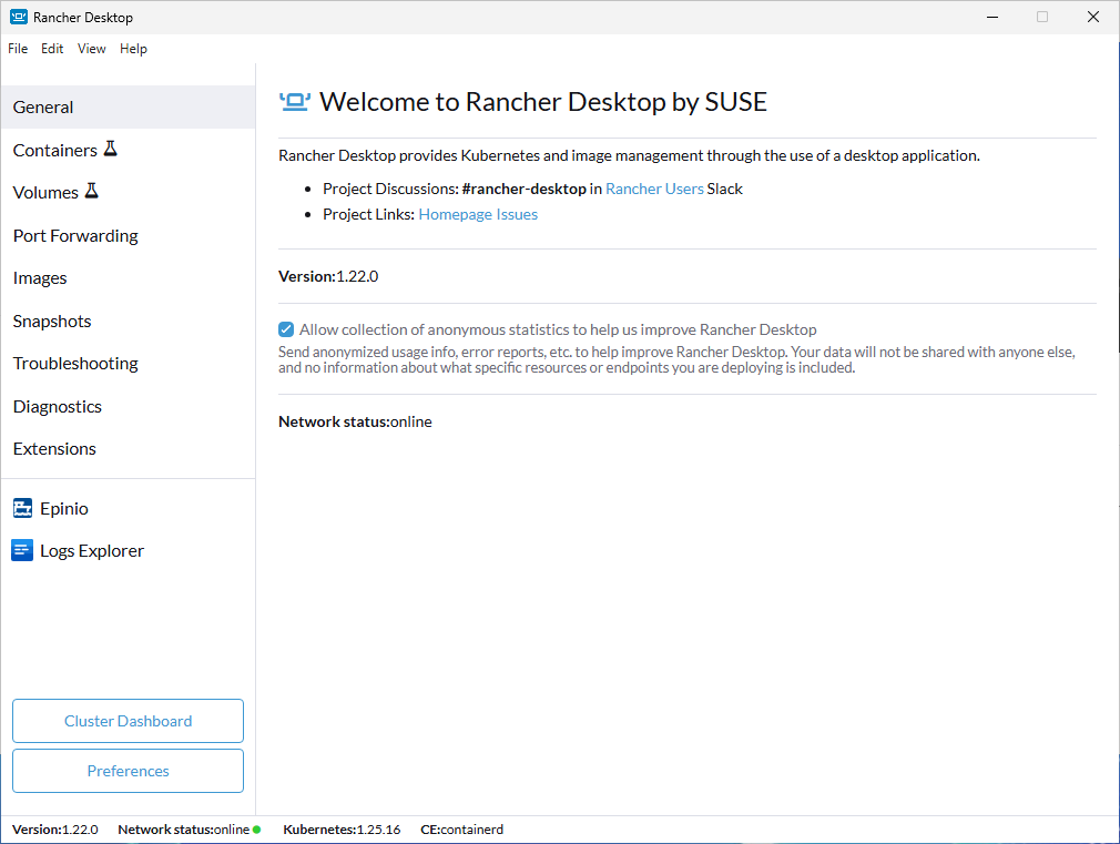 The General tab provides information on communication channels where users can connect with the Rancher Desktop team and community to ask questions, report bugs, or discuss Rancher Desktop in general.