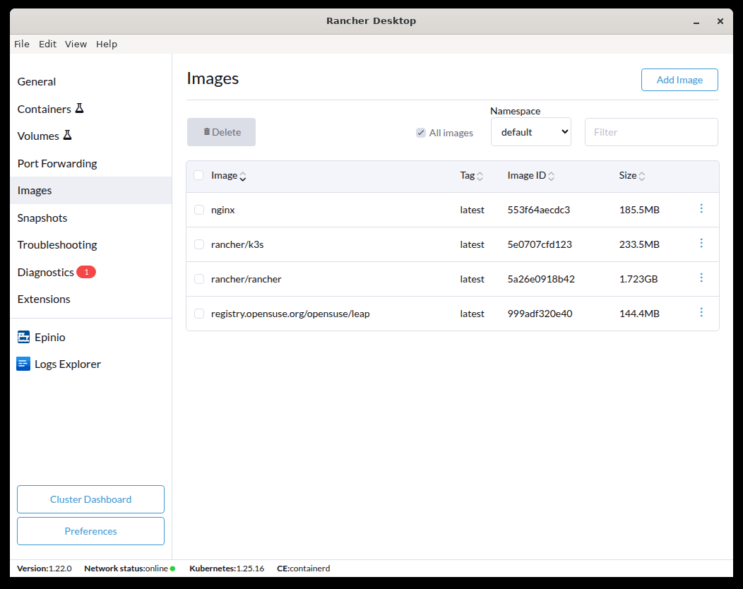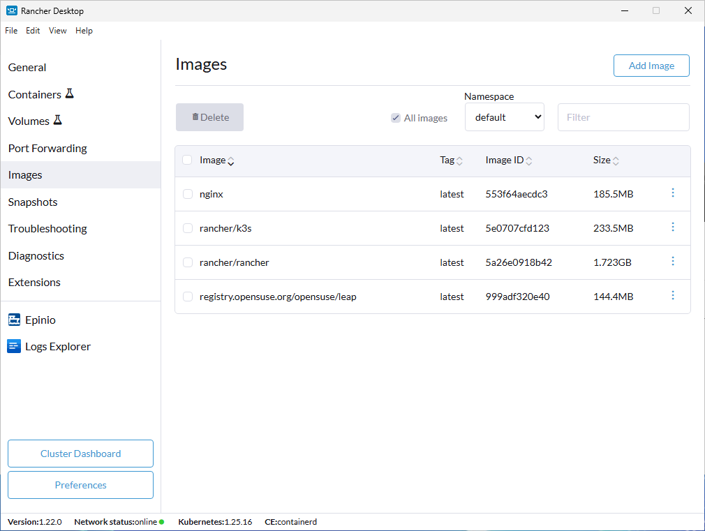 • Delete: This option is only available using the container engine dockerd (moby). Images can be selected from the display view and deleted using the Delete button.