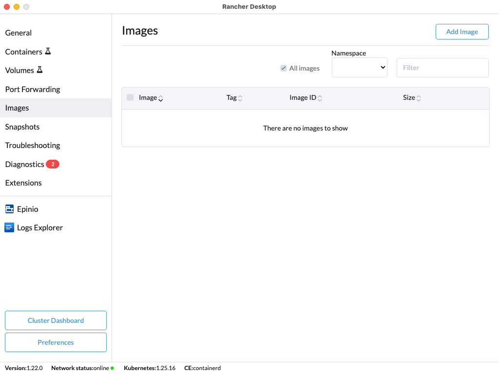 • All Images: This option is only available using the container engine containerd (nerdctl) and k8s.io namespace. This checkbox can be marked to list all images including default application images in the Rancher resource group.