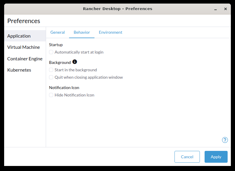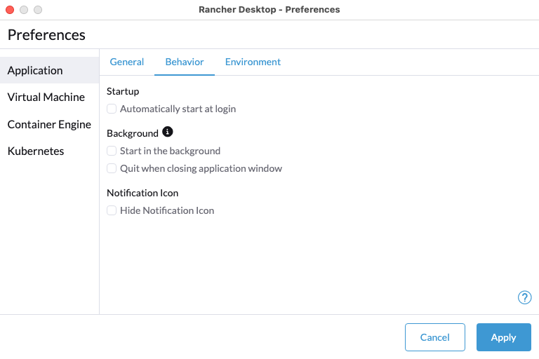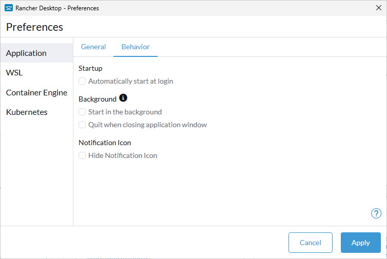 Rancher Desktop can automatically be started as part of the user login process. This will take all other behavior settings from the page into account as well.