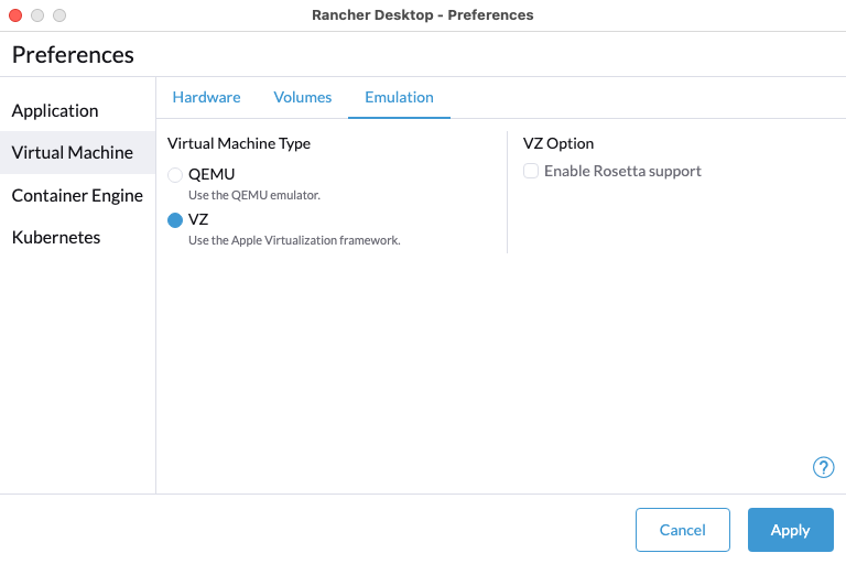 The suboption VZ option can also be enabled if using VZ as your virtual machine type. The suboption enables Rosetta support and allows users to run applications that contain x86_64 instructions on Apple hardware.