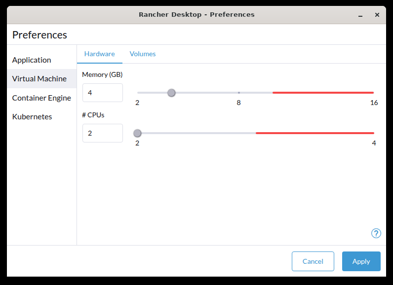 The amount of memory to allocate to Rancher Desktop. The selectable range is based on your system. The red area within the range indicates an allocation that may affect system services.