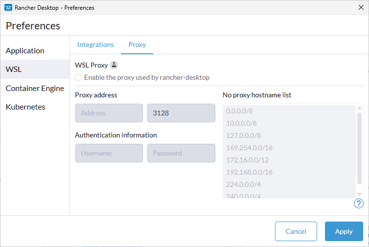 Rancher Desktop now allows local, corporate, or VPN proxy server support for Windows users. The implementation can be enabled or disabled through the Proxy tab to capture network traffic and forward it to an http proxy. Once all information has been input, click the Apply button to have changes immediately take effect.